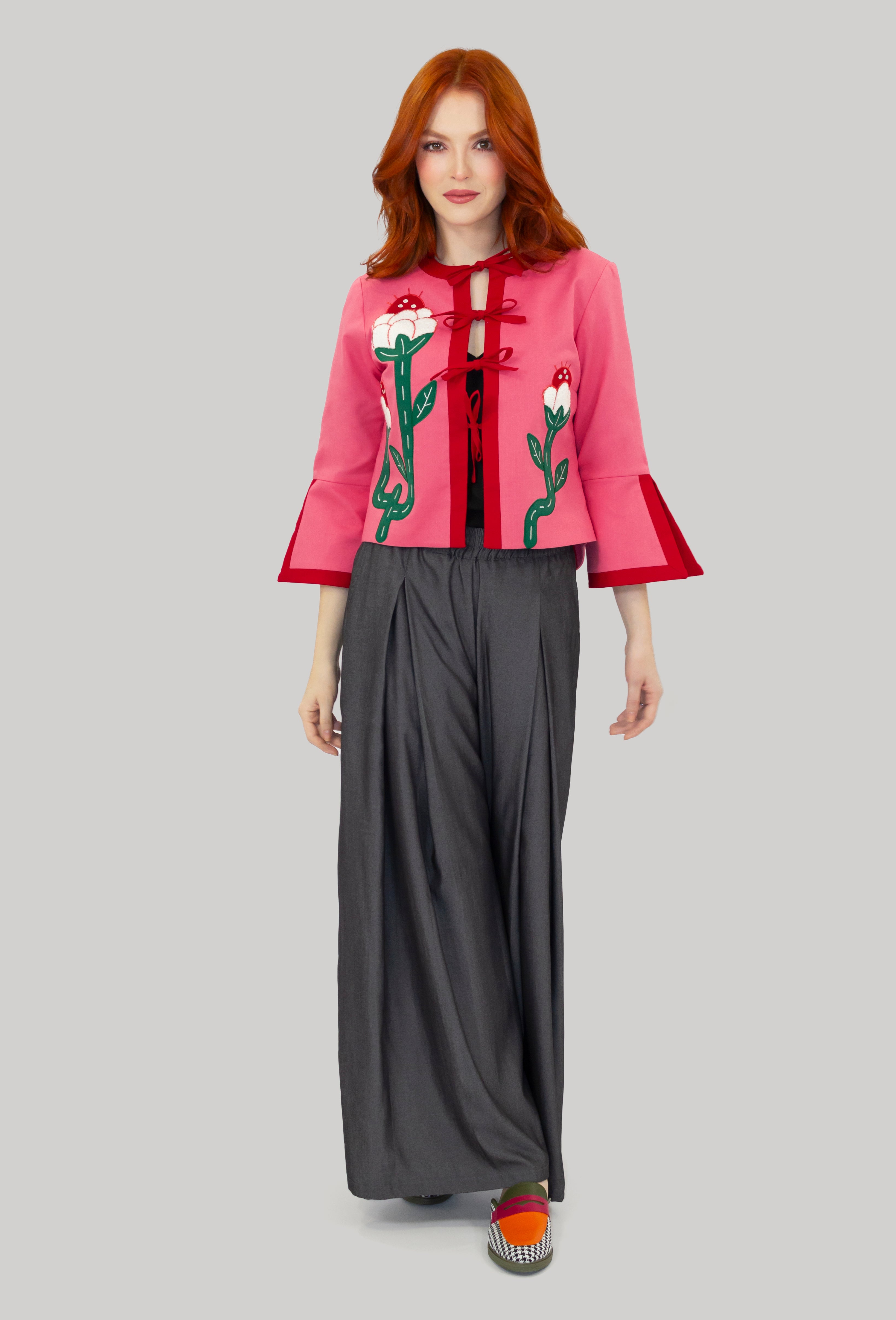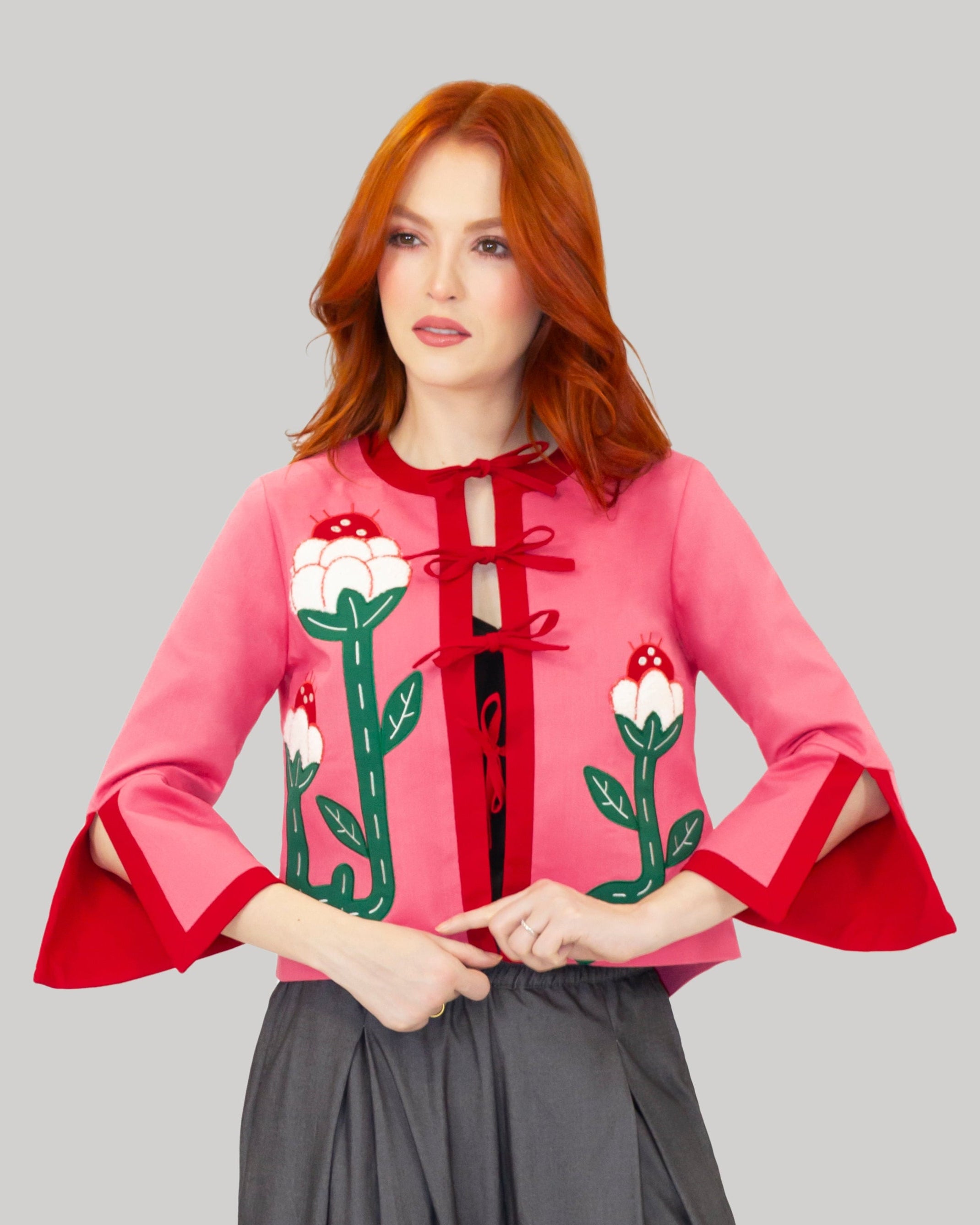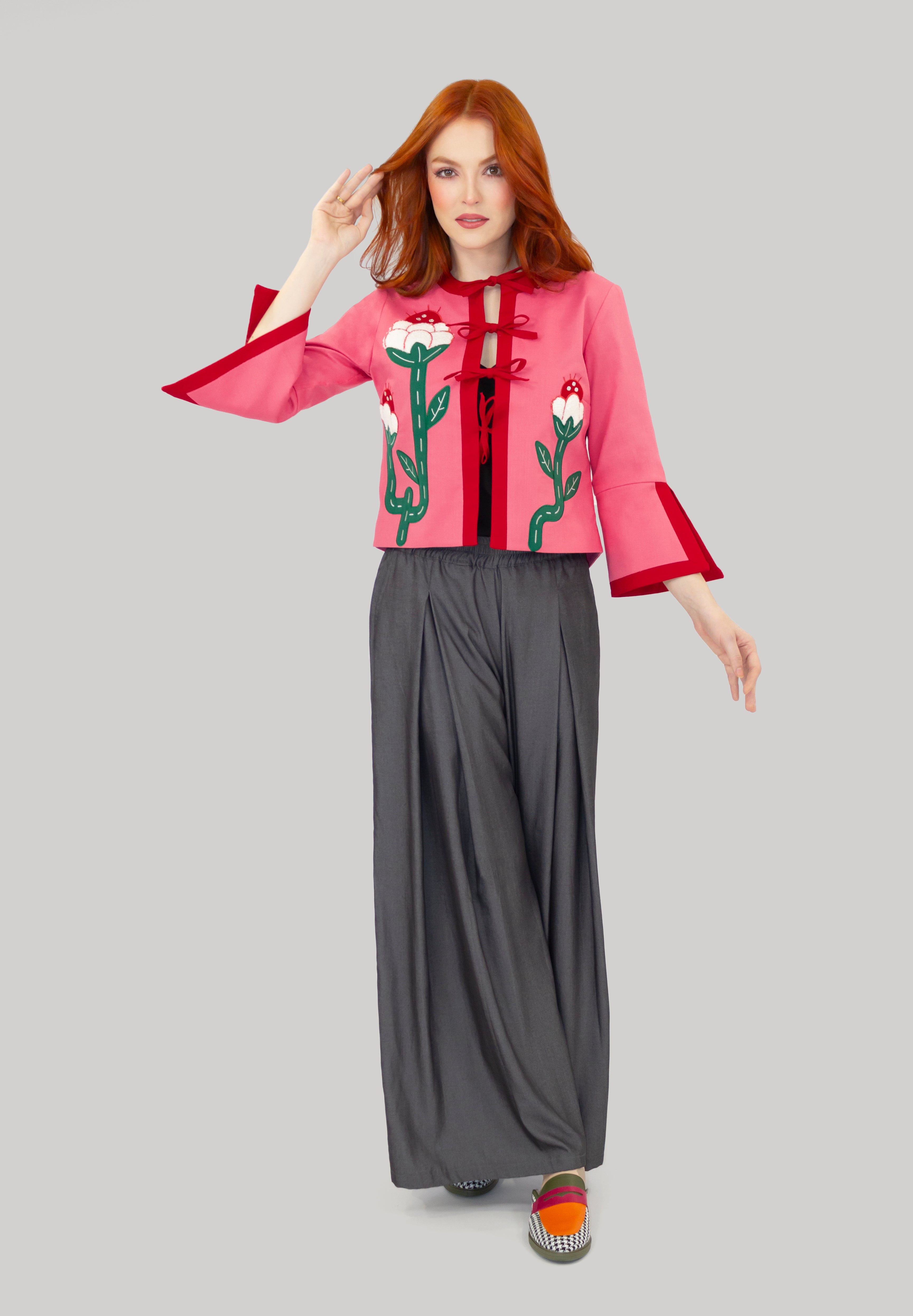 Chaqueta en lino viscosa, color rosa lichi, apliques y bordados de flores exóticas. Rebordeada con franja roja y ancha. Puños 3/4 con abertura profunda. Sistema de amarre con lazos delgados. Con forro fresco en tono a contraste.