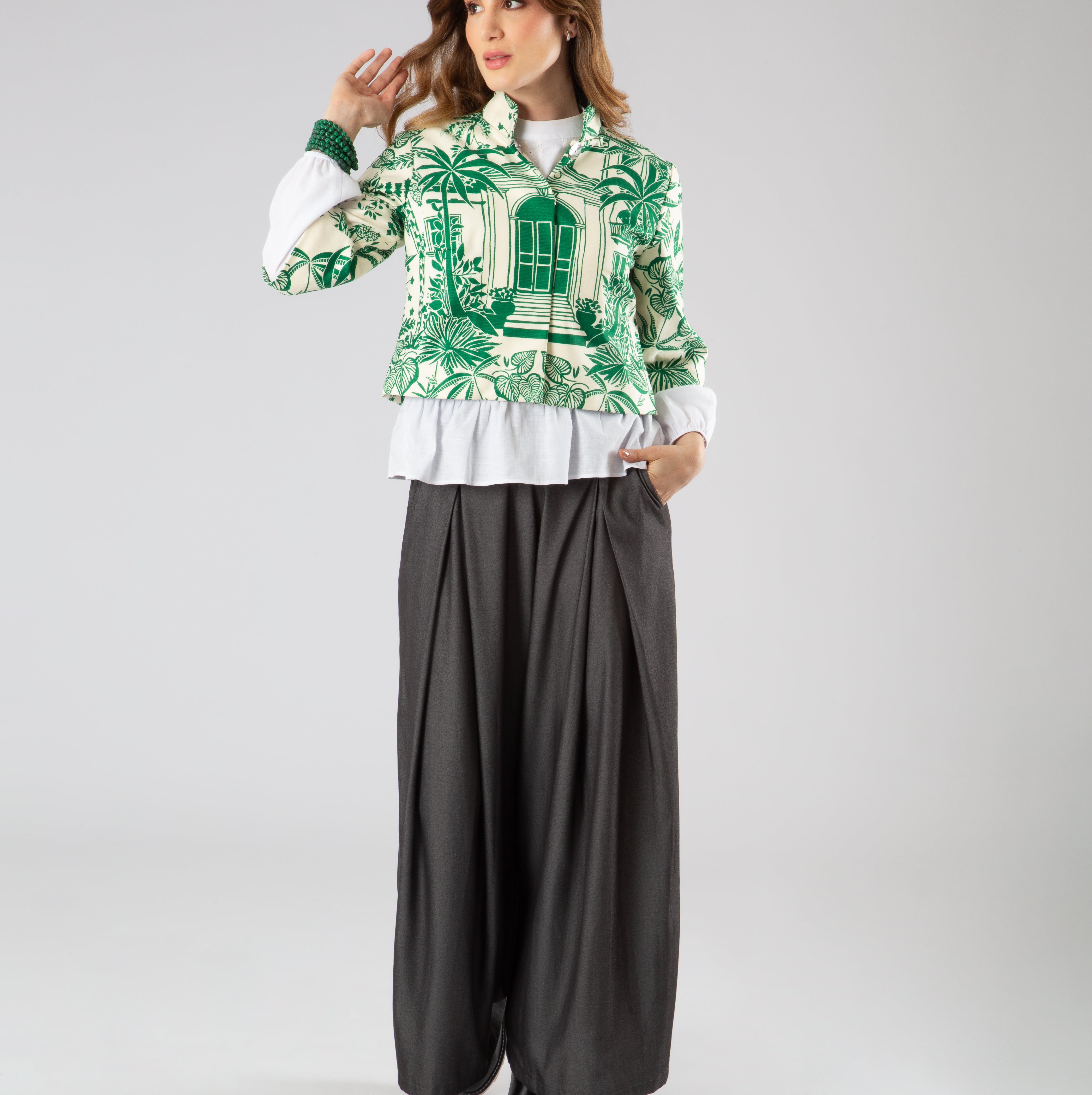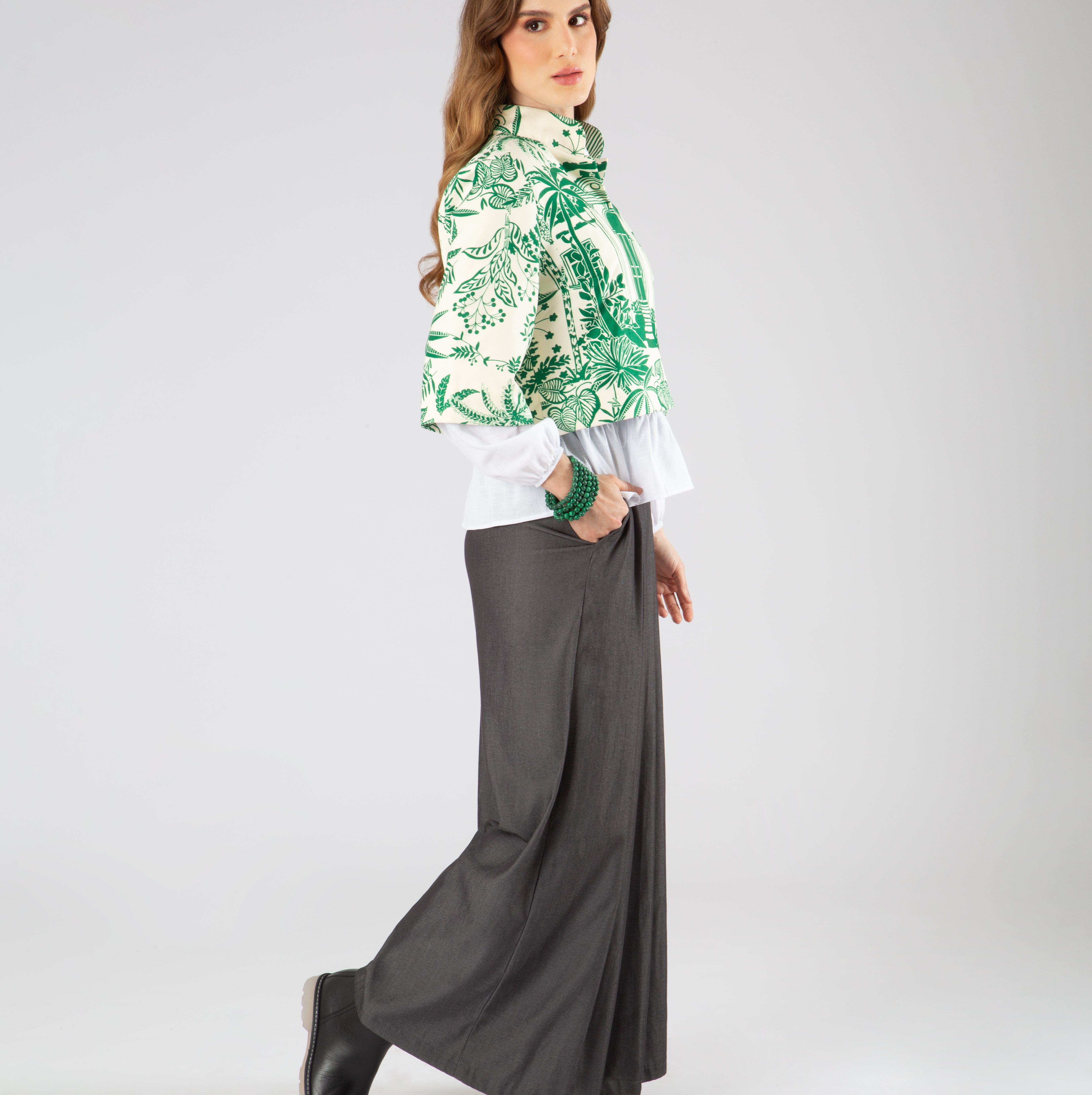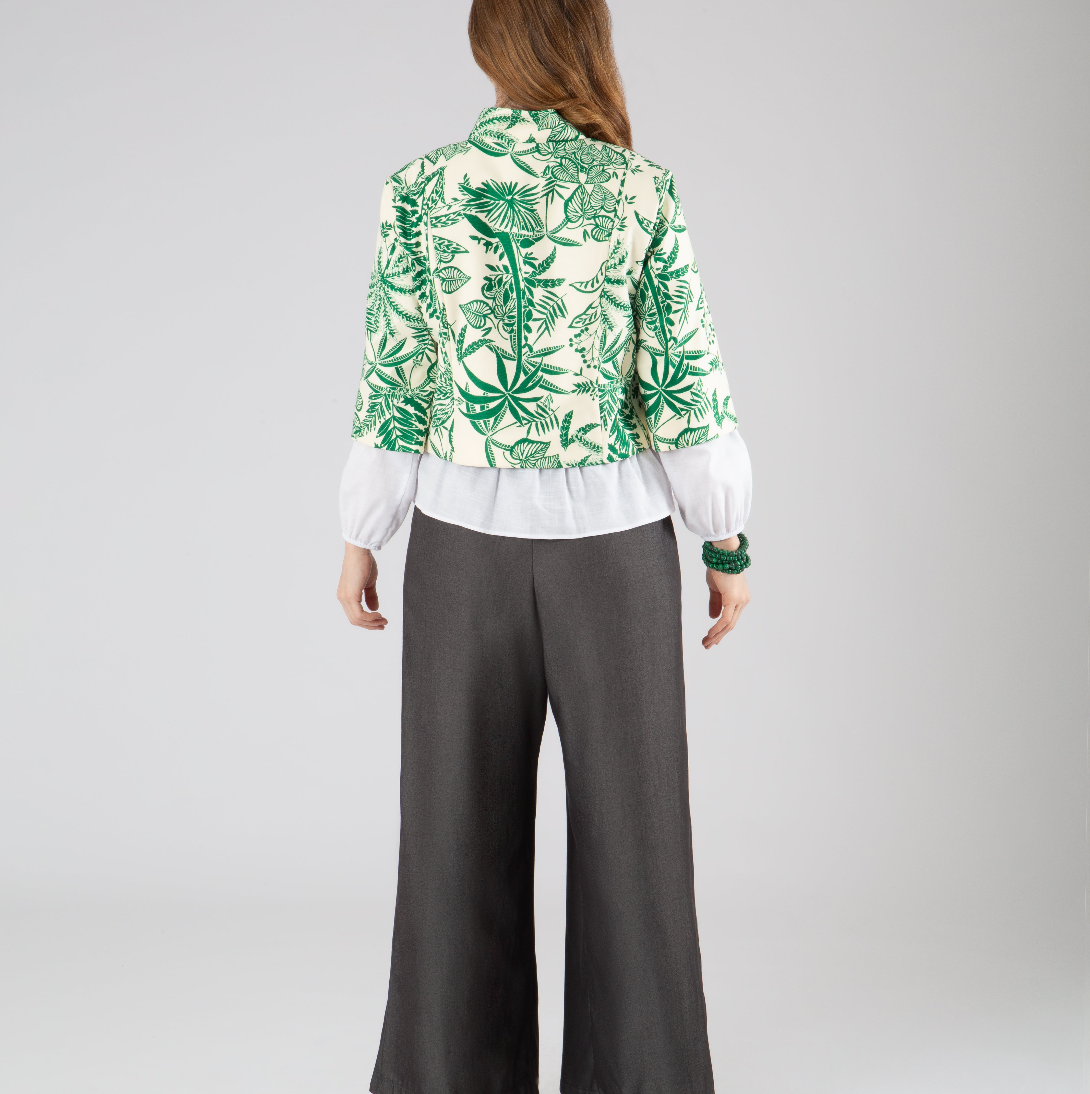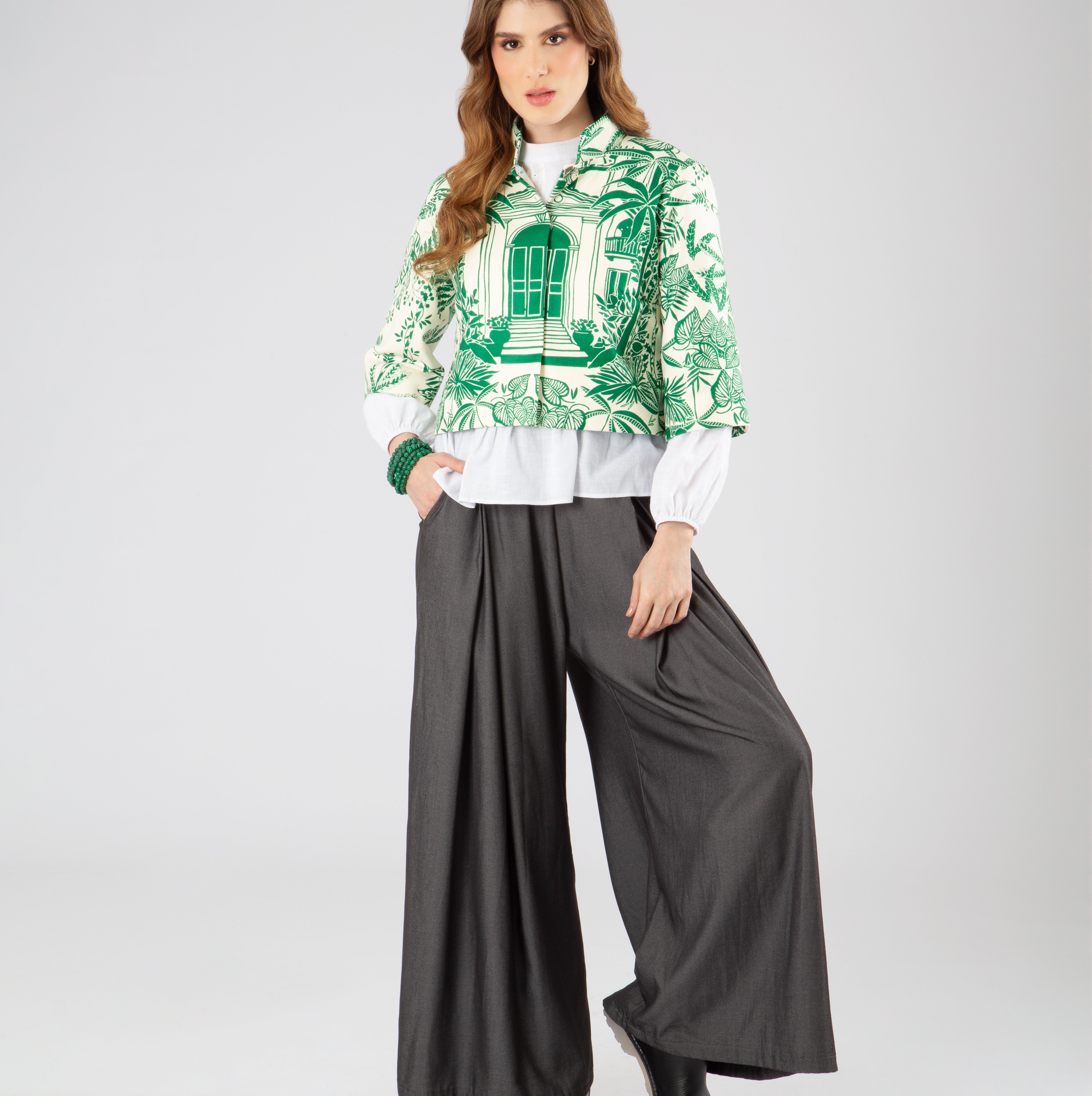 Su cuello tipo lazo en lino de pepas blancas sobre fondo negro aporta un aire elegante y juguetón, ideal para llevar anudado o suelto. El diseño se complementa con un cierre pavonado oculto, mangas rectas 3/4 con paneles contrastantes, y bolsillos tipo sastre con tapa para reforzar su espíritu utilitario. Y otros más en laterales ocultos en costuras