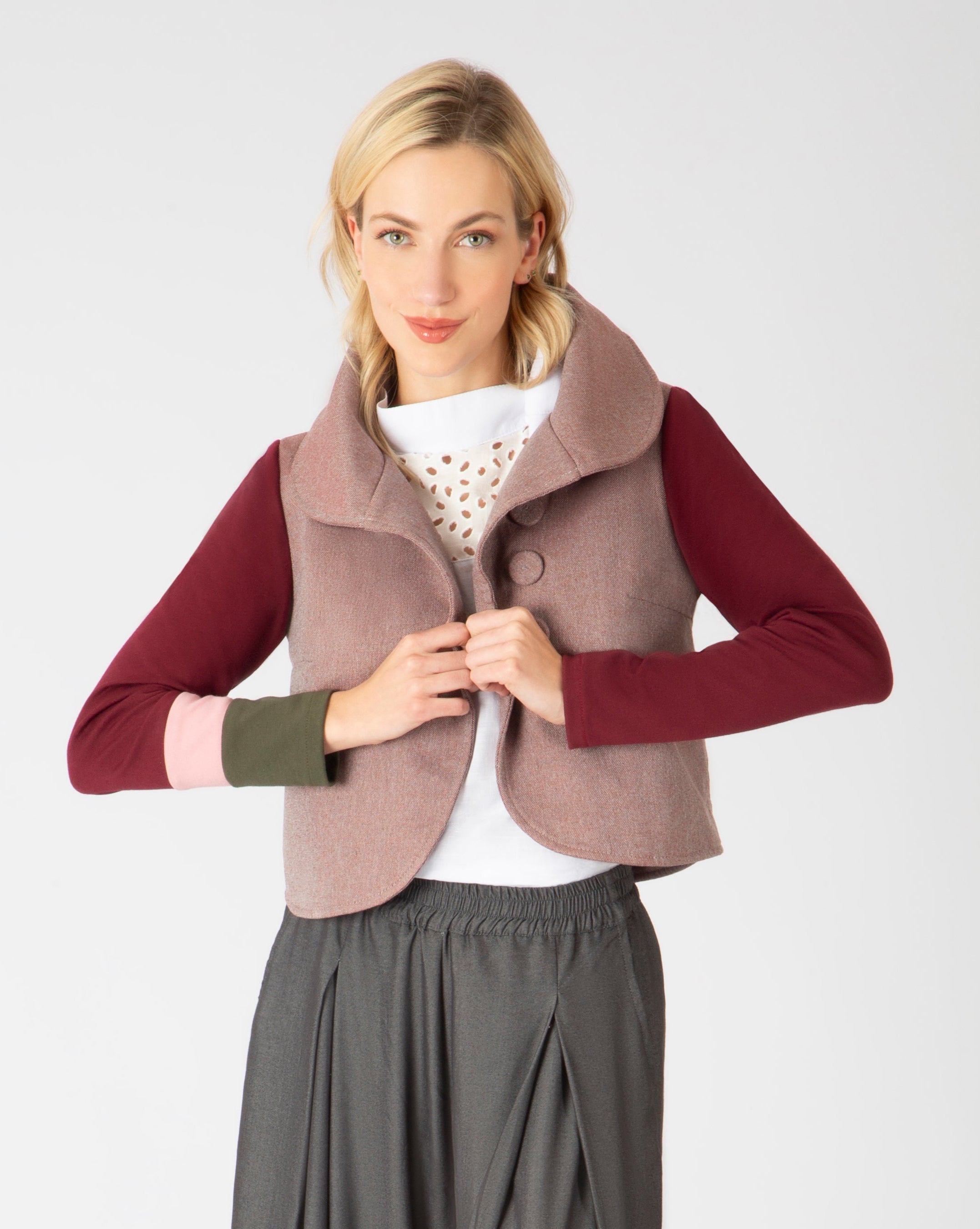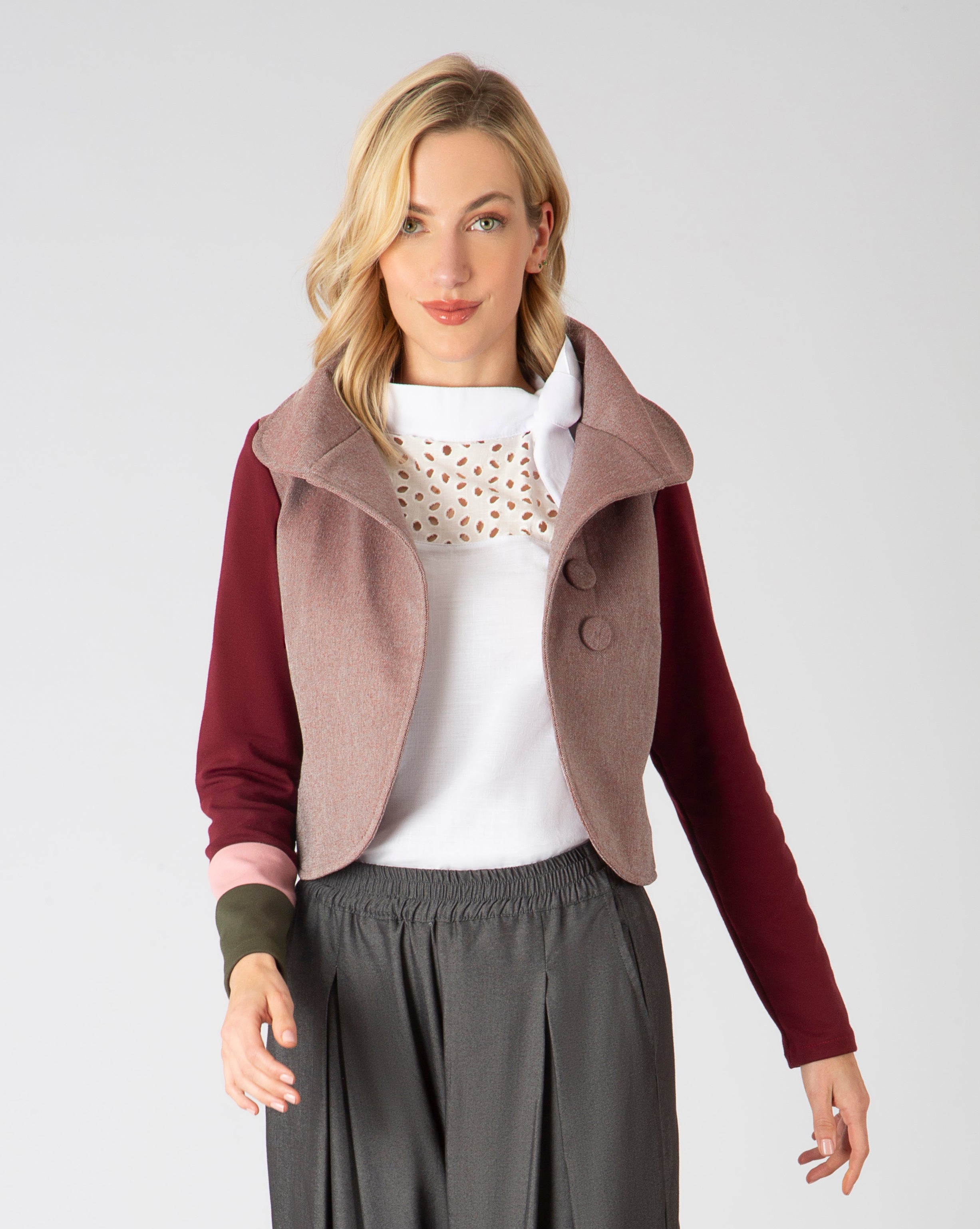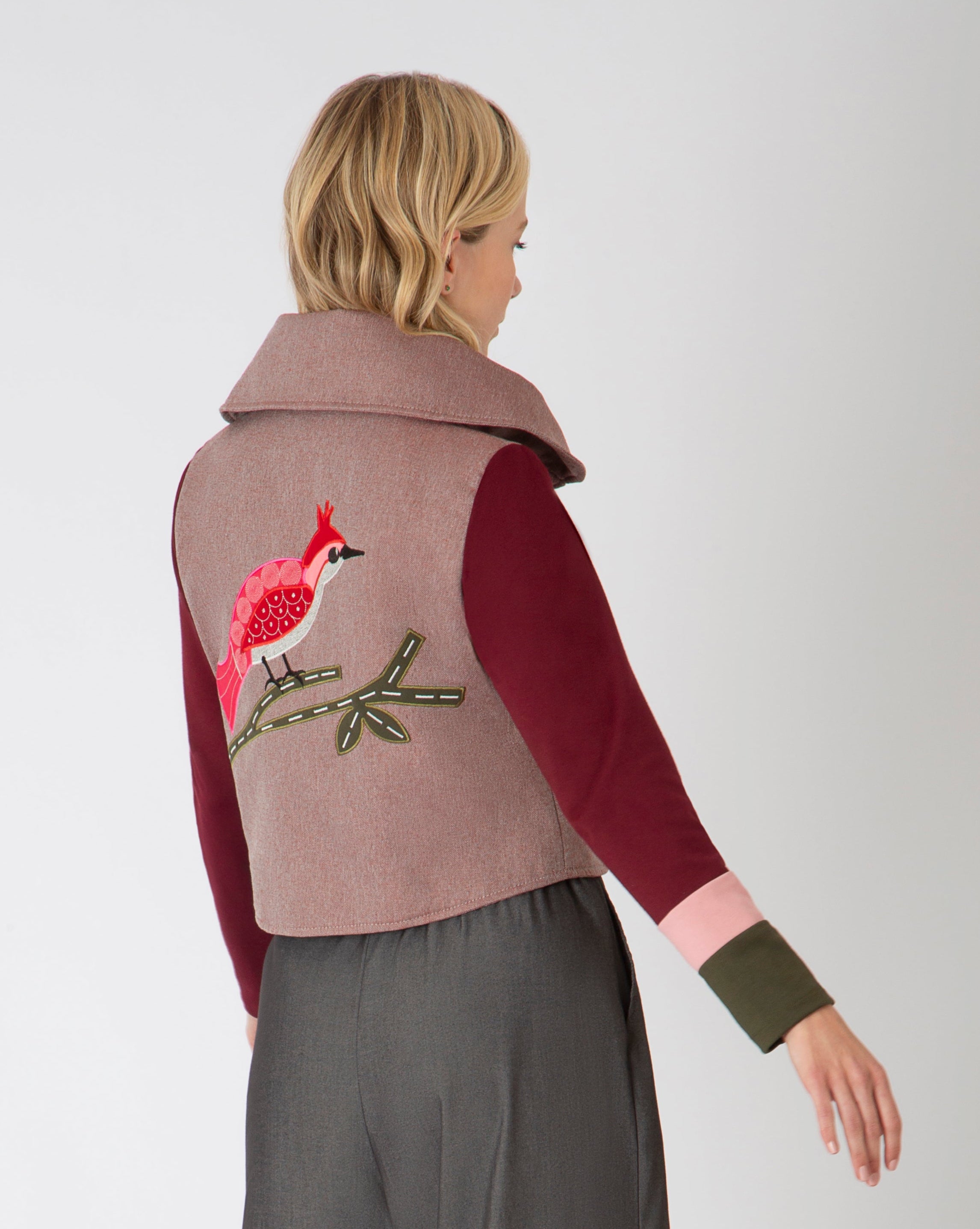 Chaqueta corta en paño poliéster texturado, con estructura firme. La prenda presenta un cuello tipo solapa amplia y abierta, que aporta elegancia y volumen a la parte superior. En la espalda destaca un aplique bordado directamente sobre la pieza, ave tipo cardenal, en tonos fucsia, vino y rosa. Mangas largas elásticas en tono vino con cortes en contraste en puños de tonos oliva y rosa claro, integrando armonía cromática y un aire moderno. El frente se cierra con botones forrados tono a tono.