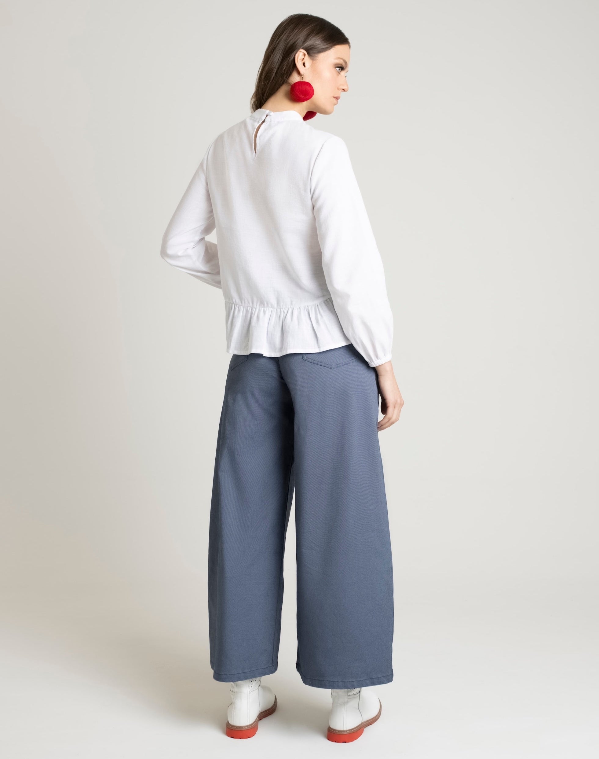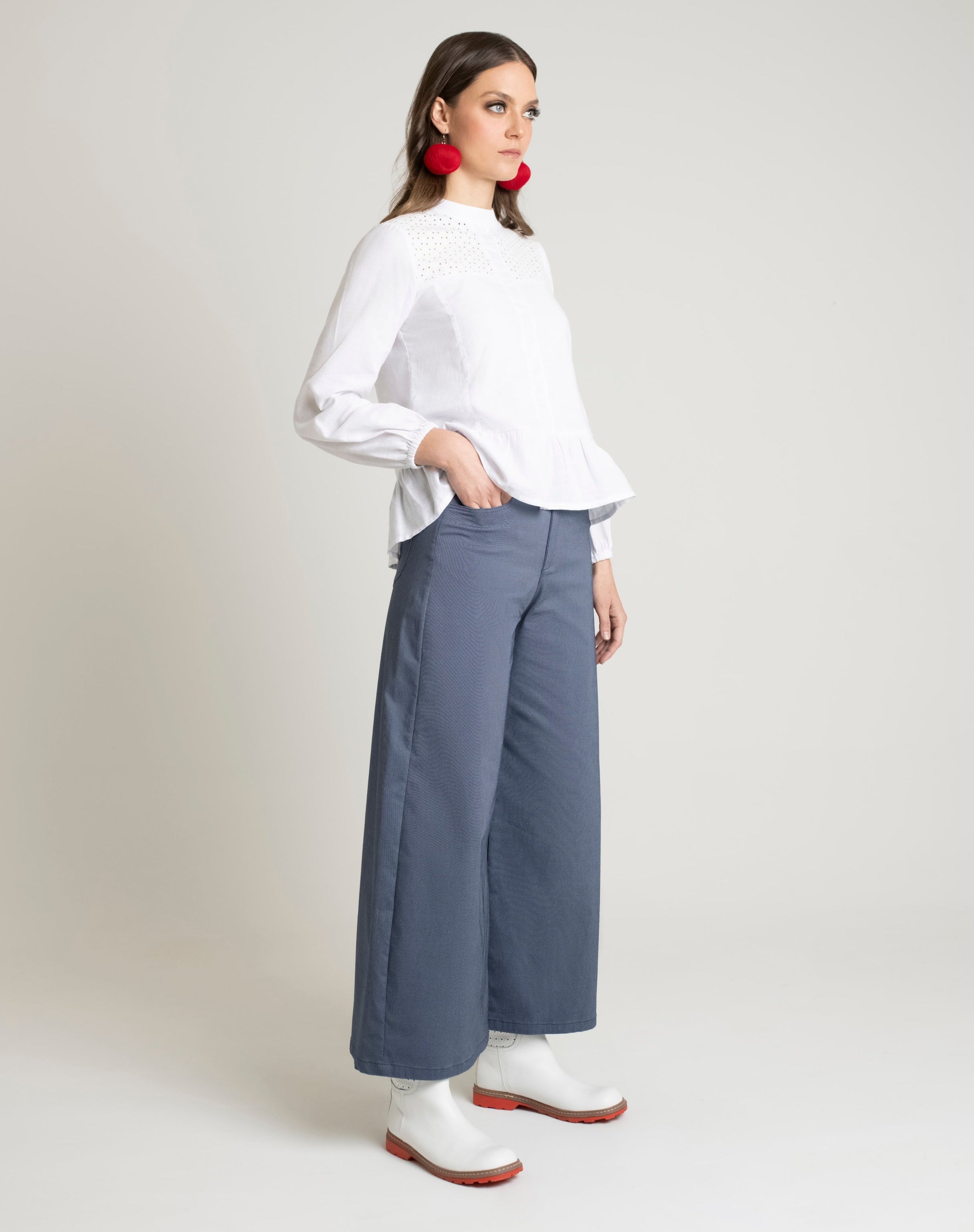 Original silueta tipo capullo, ultra cómodo. Con 5 bolsillos y pretina. En bengalina con look jean. Por su diseño unicolor es ideal para combinar con nuestras más vistosas chaquetas.