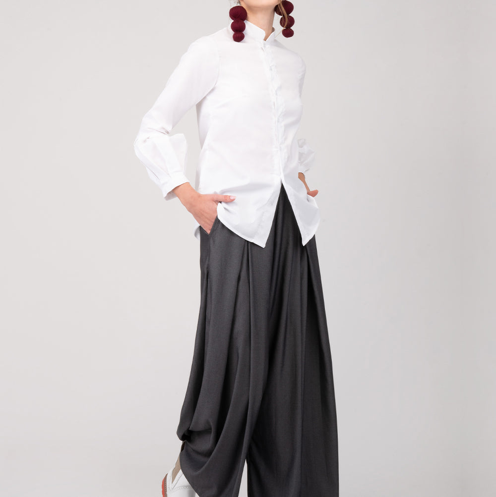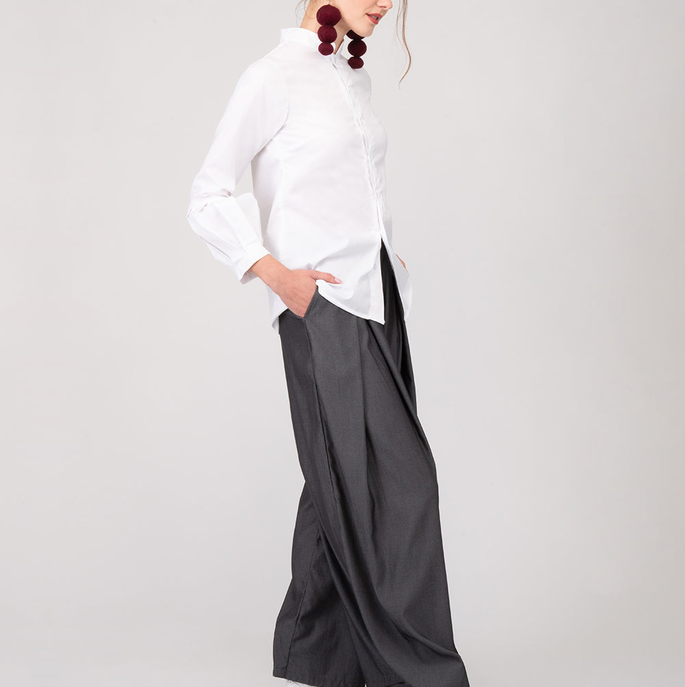 Su cuello tipo lazo en lino de pepas blancas sobre fondo negro aporta un aire elegante y juguetón, ideal para llevar anudado o suelto. El diseño se complementa con un cierre pavonado oculto, mangas rectas 3/4 con paneles contrastantes, y bolsillos tipo sastre con tapa para reforzar su espíritu utilitario. Y otros más en laterales ocultos en costuras