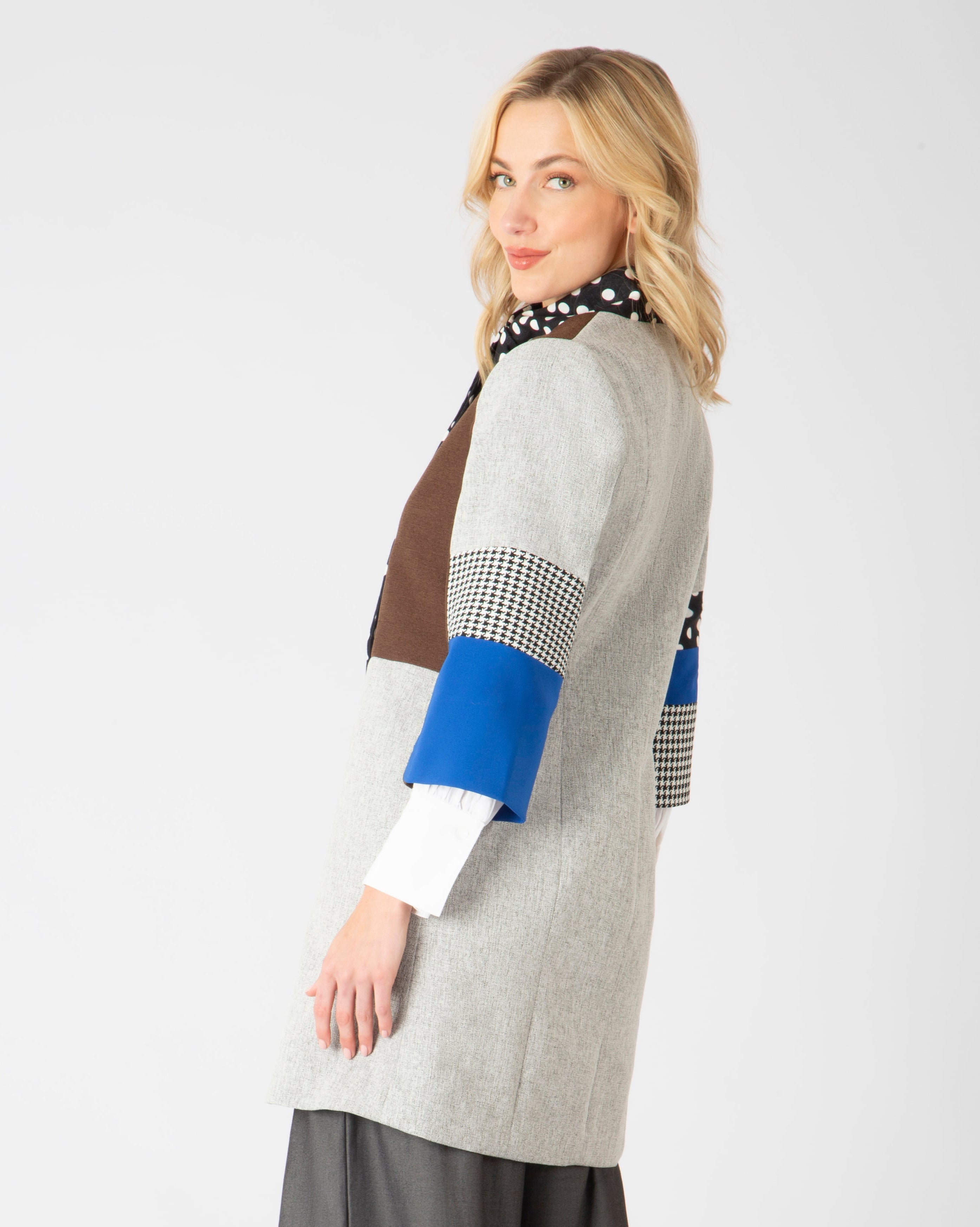 El forro en contraste, junto con el uso de bloques marrón chocolate, azul eléctrico y blanco puro, hacen de esta pieza una verdadera declaración de estilo contemporáneo, ideal para mujeres que disfrutan vestir con carácter y singularidad.