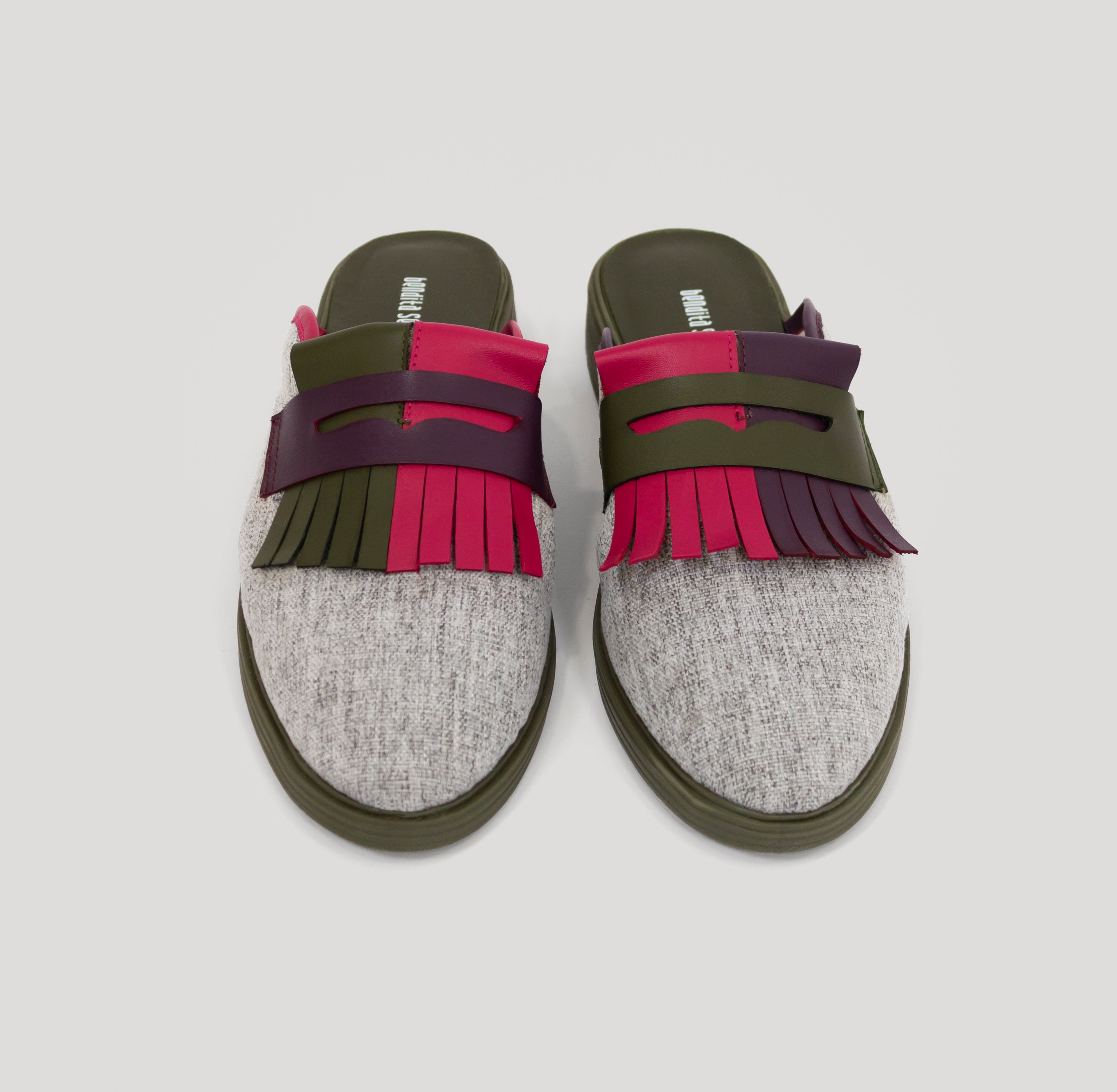 Detalle: Aplique bordado de serpiente en tonos verdes olivo con detalles fucsia y rosa, saliendo del bolsillo.