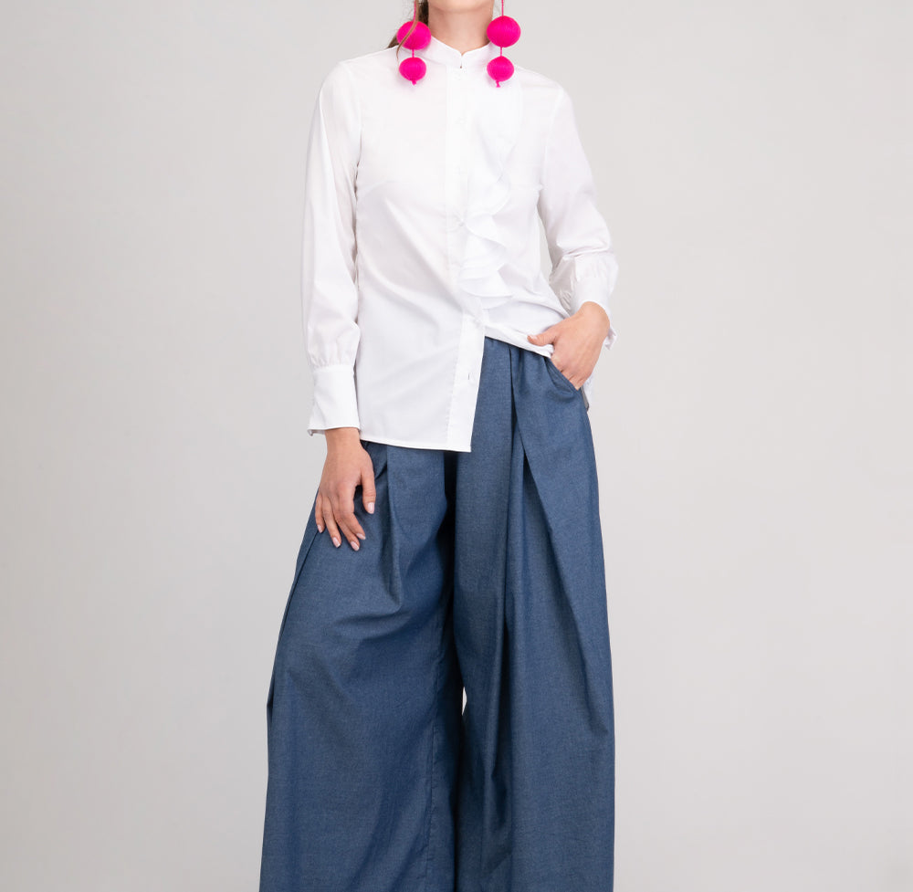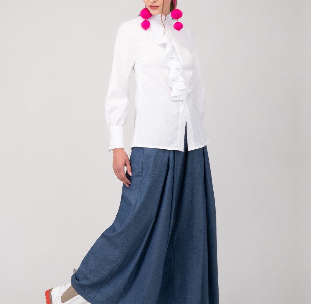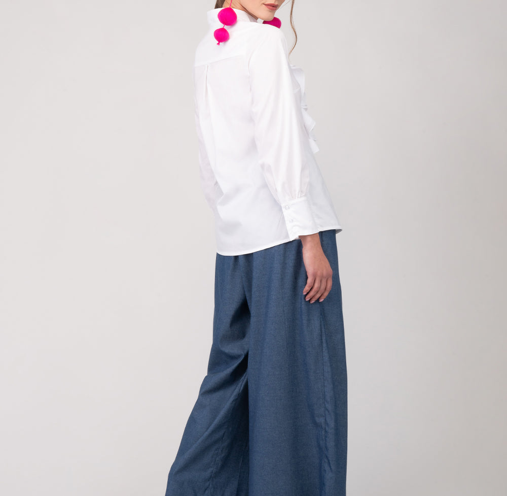 Atrevida y con carácter: así es la camisa Boa, una prenda que combina la sobriedad del blanco con un elemento visual poderoso y a la vez divertido.