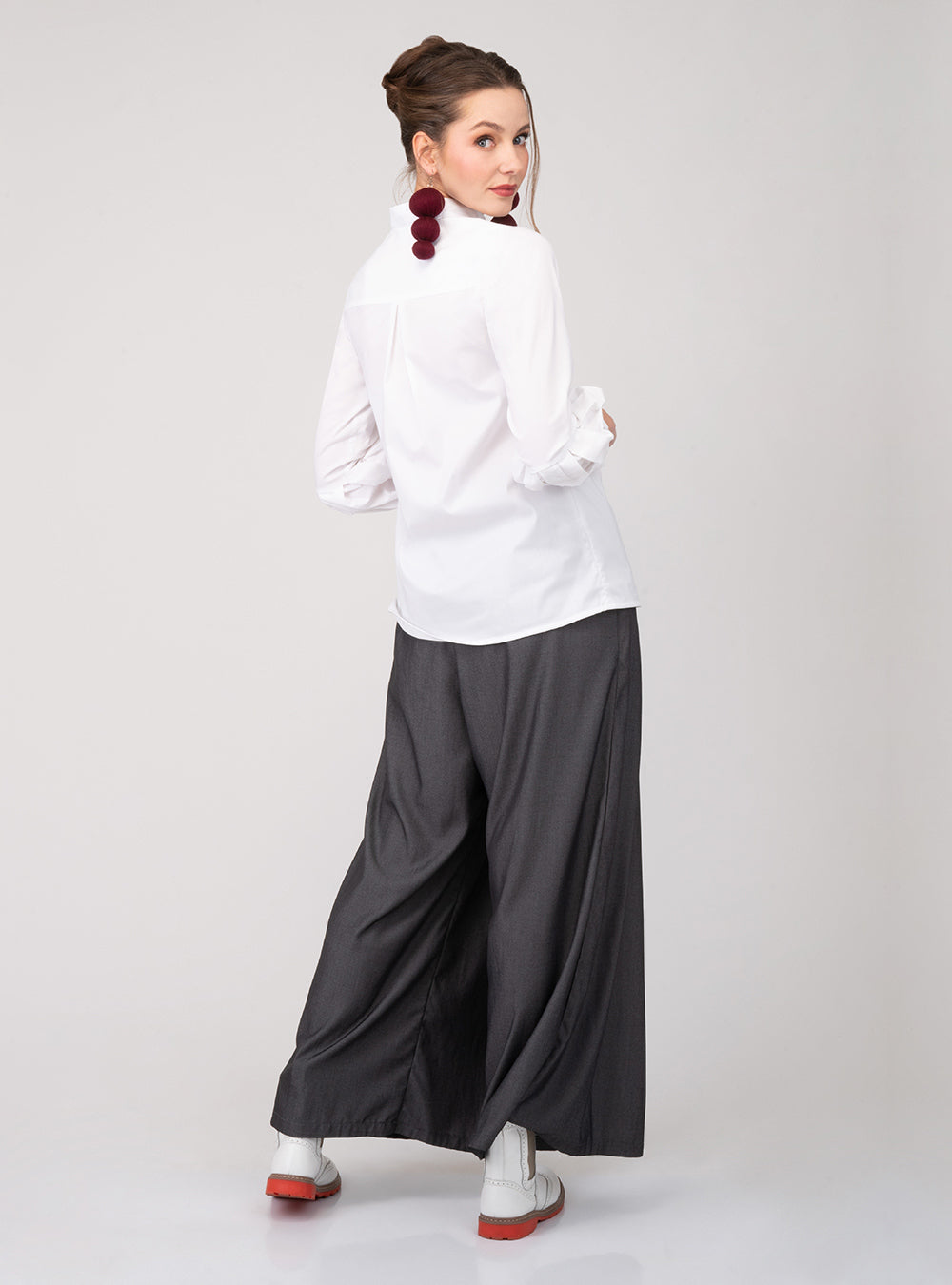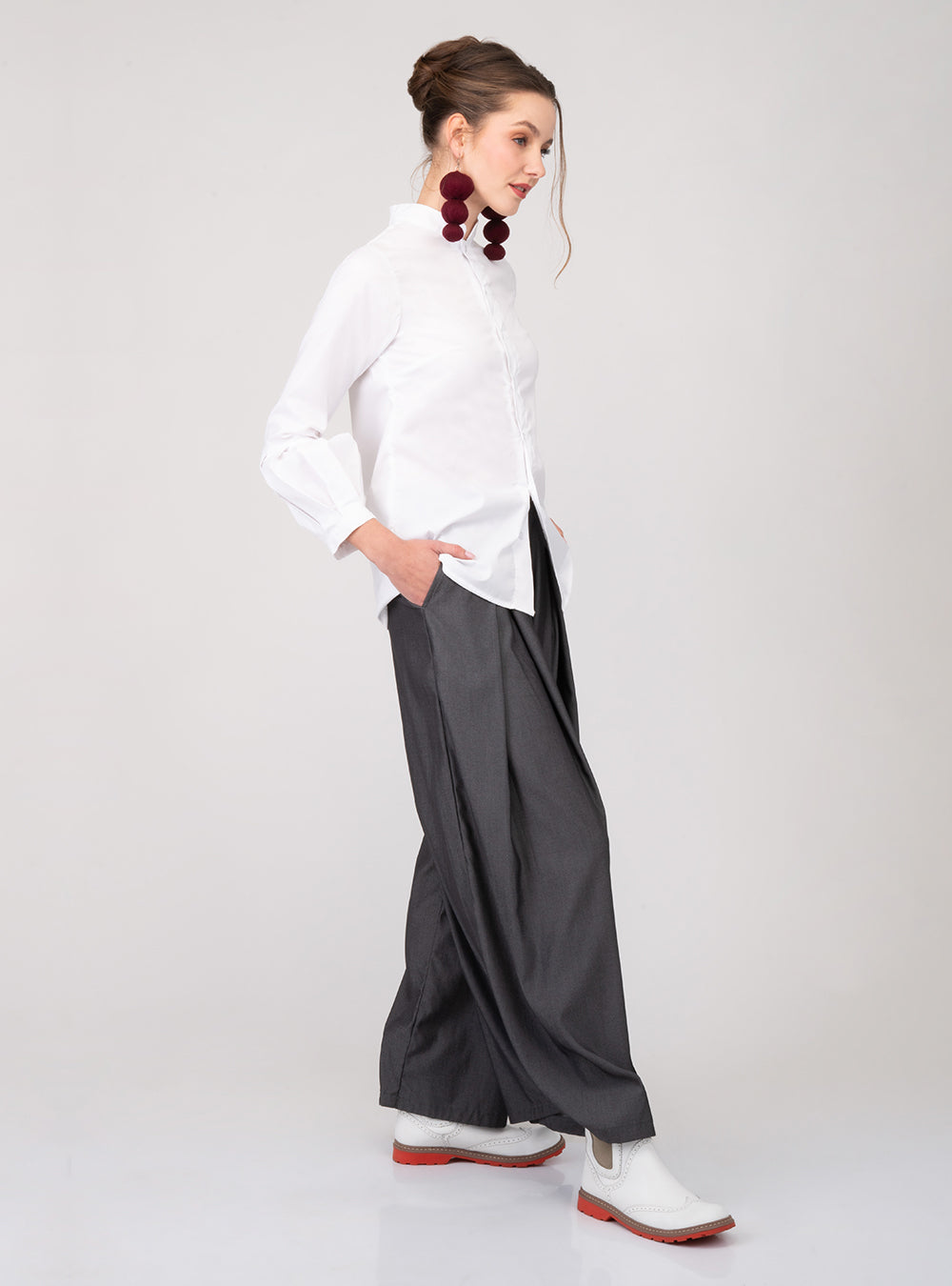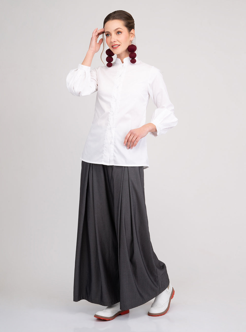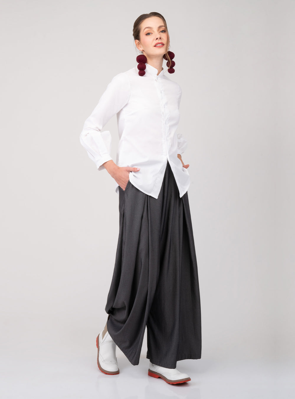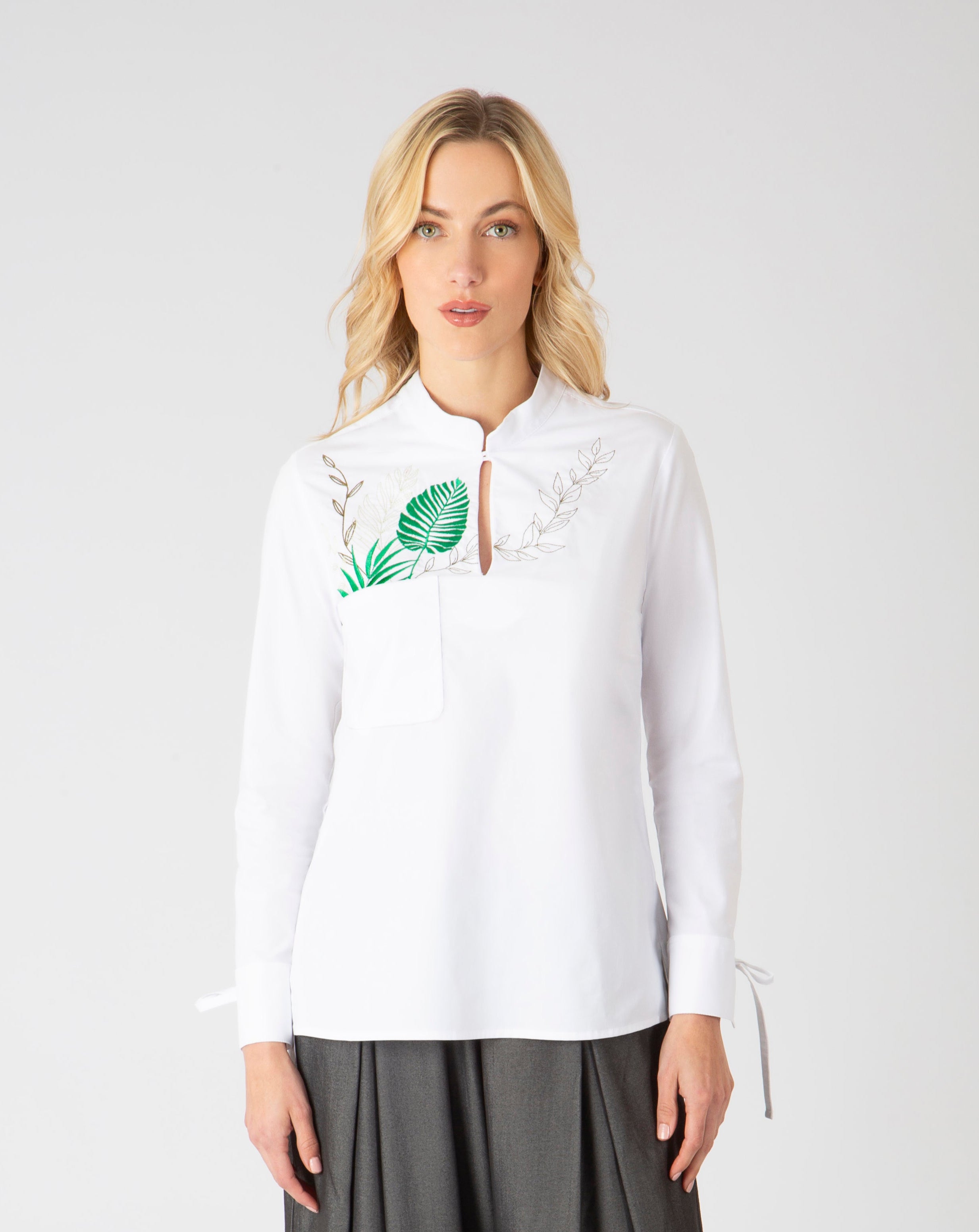 Con un cuello mao contemporáneo y abertura frontal en lágrima, esta camisa equilibra la sobriedad del corte con la expresividad del bordado. Las mangas largas con puños clásicos largos con abertura y sistema de amarre de tiras, aportan estructura sin rigidez, ideal para llevarla tanto por dentro como por fuera.