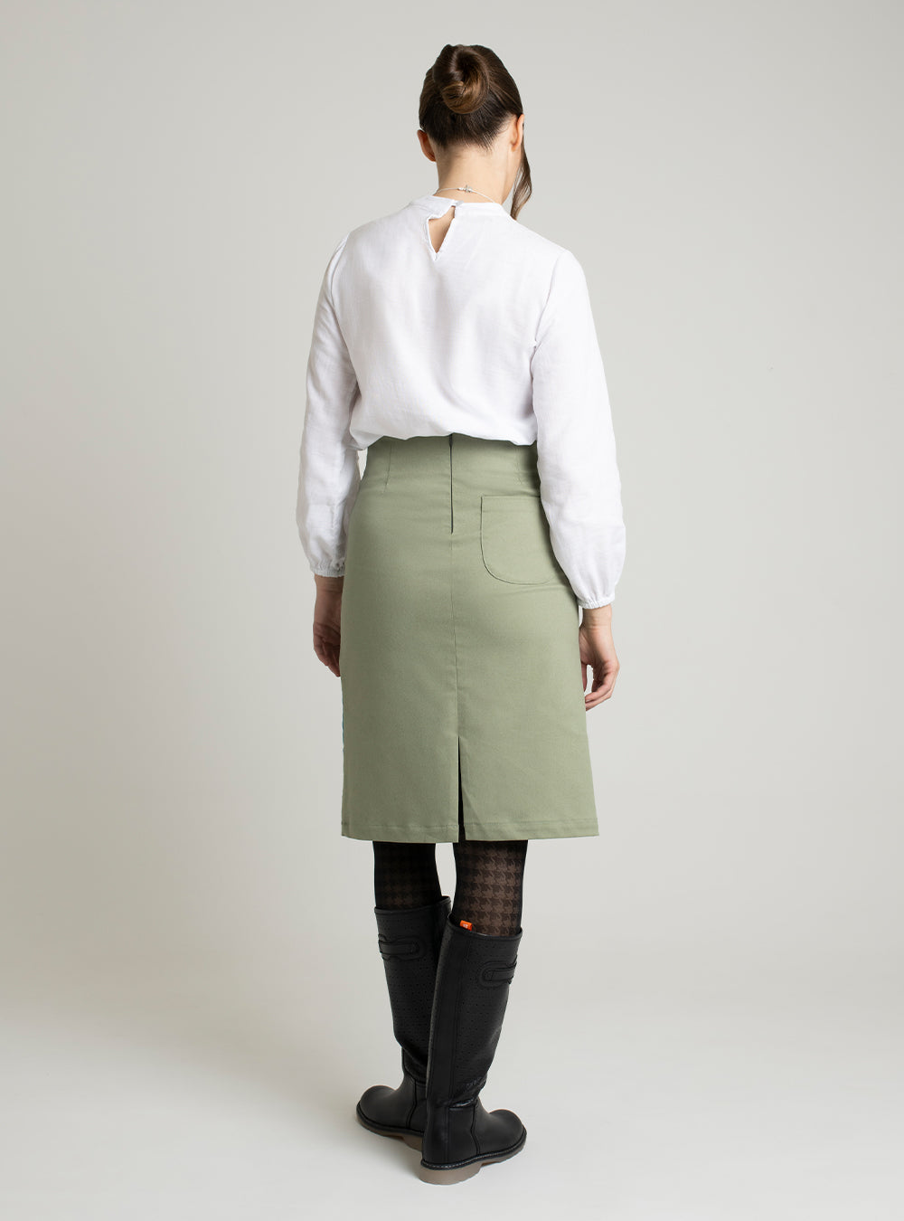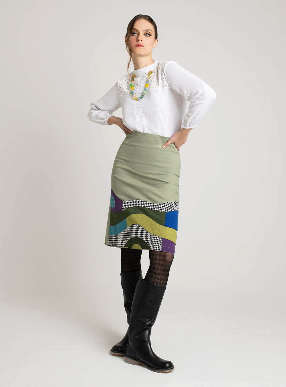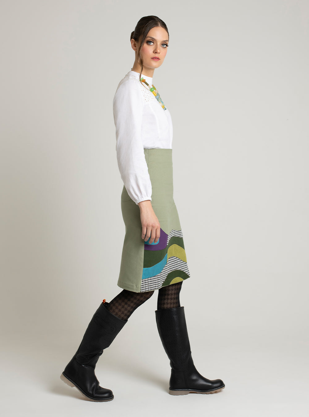 Falda verde en tejido mate. Cintura ajustada con silueta semi A, apliques en delanteros y abertura en posterior.