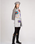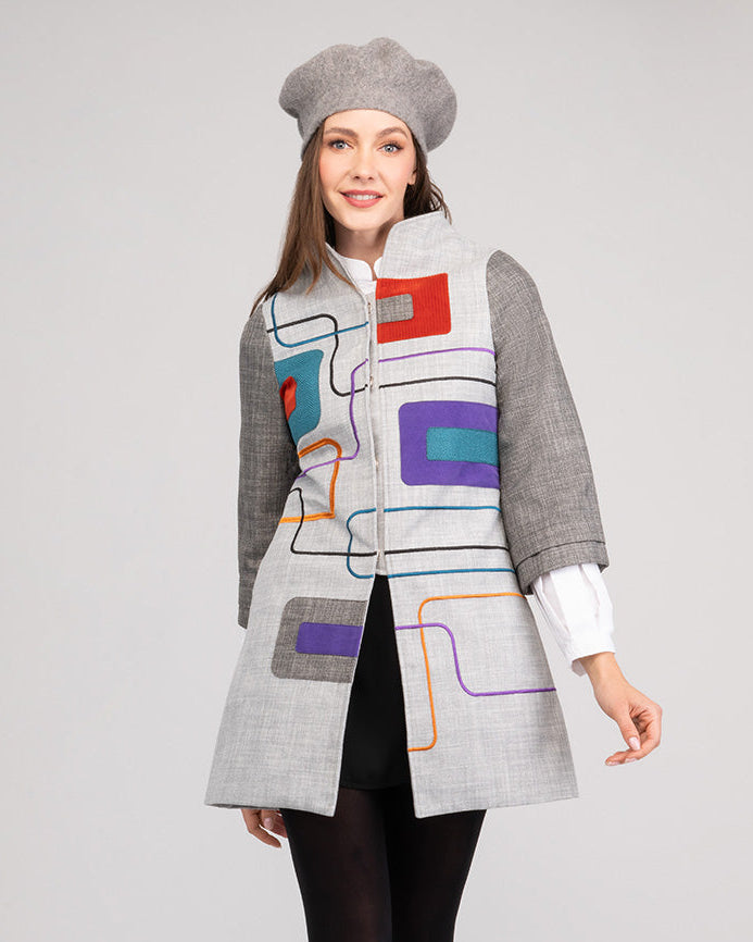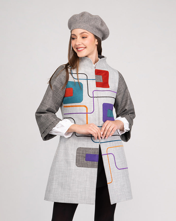 Abrigo gris con contraste de color y mezcla textil en poliéster y tejido mate. Cuello alto con bordado y apliques en delanteros, bolsillos laterales tipo ojal, manga 3/4 ancha con prenses.
