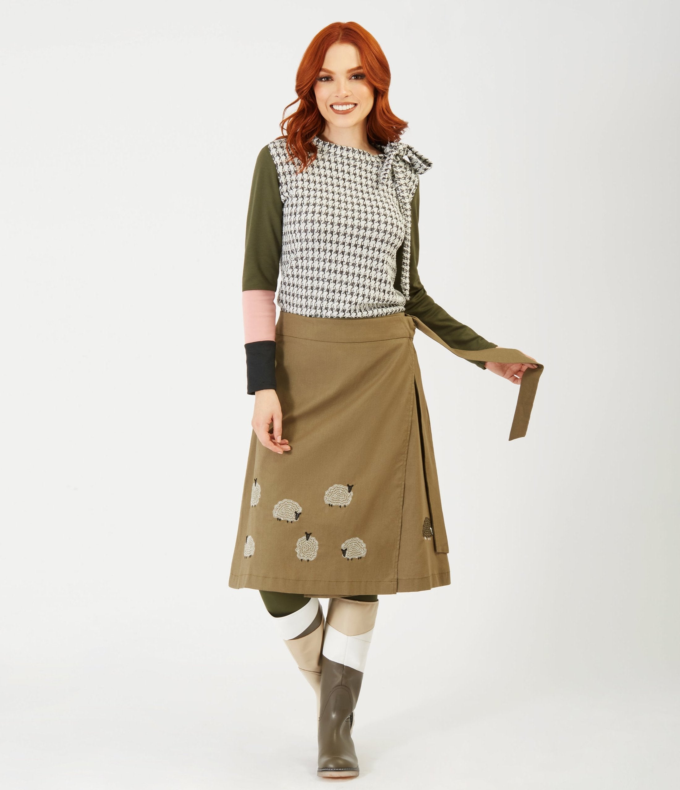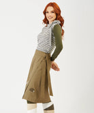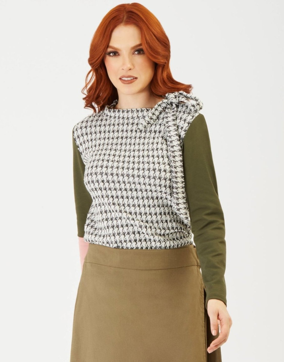Buzo en tejido de punto tipo tweed con mangas combinadas en rip elástico. Cuello con amarre de lazo.