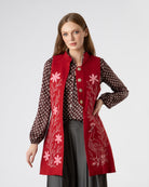 Chaleco largo rojo granate con broches niquelados a presión. Cuello Mao, y aberturas laterales. Con forro ligero a contraste. Bordado mixto en técnica plana y chenille.